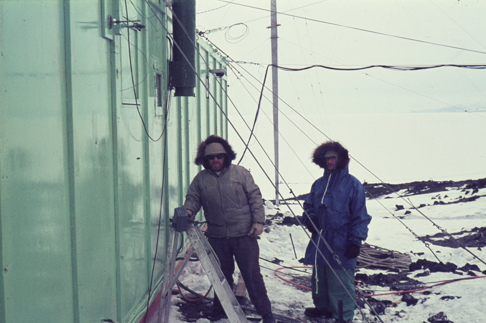 DescriptionRepairing 'Lead In' Cables at Side of Scott Base LabPhotographerJ W BeagleySeason1966-1967Date Taken1966-1967 SeasonOriginalSlideNo. People2-5LocationScott BaseGeolocation[1] Position