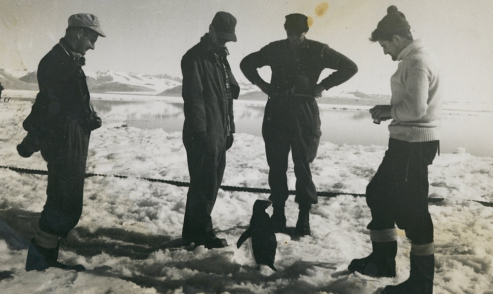 Trans Antarctic Expedition and crew members make the aquaintance of an Adelie penguin near Butter Point. Antarctica NZ, accessed 25/03/2026, https://adam.antarcticanz.govt.nz/nodes/view/40636