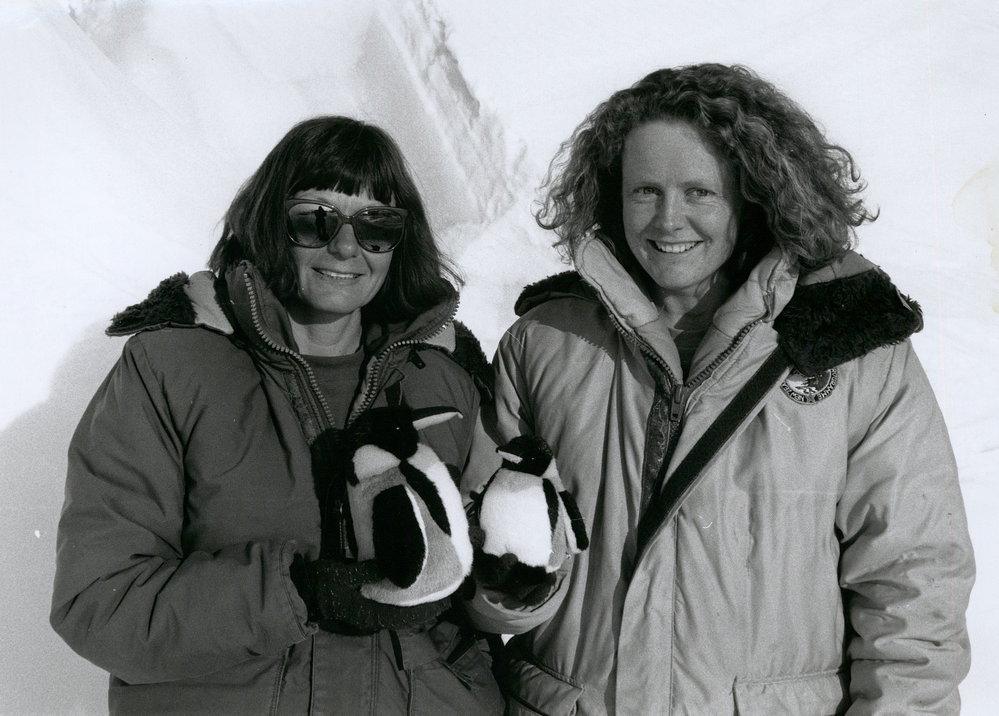 Shirley McQueen and Beth Speirs with toy versions of the penguins they are studying in Antarctica