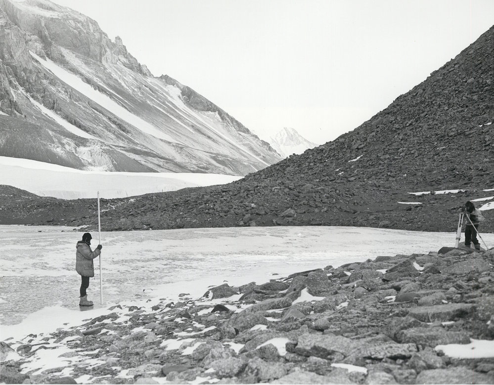 Levelling at Lake Henderson, Taylor Valley. Suess Glacier behind Nov 76