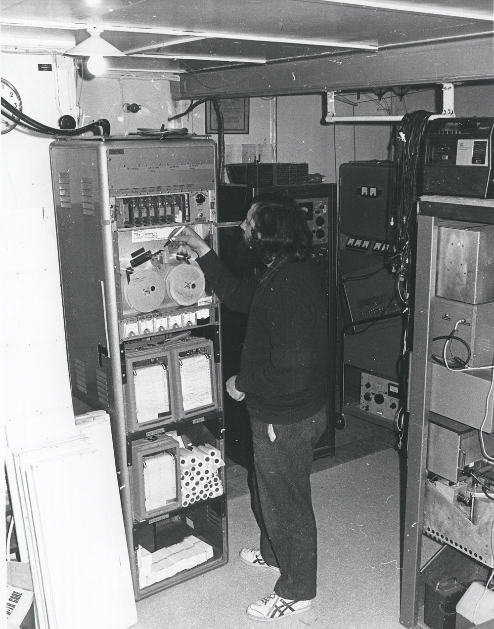 DescriptionKevin Weatherall with new infrasonic recorder in B Hut, Scott Base, 1976-1977.DepictsKevin WeatherallPhotographerRobin OrmerodSeason1976-1977Date Taken1976-1977 SeasonOriginalPrintNo. People1LocationScott Base