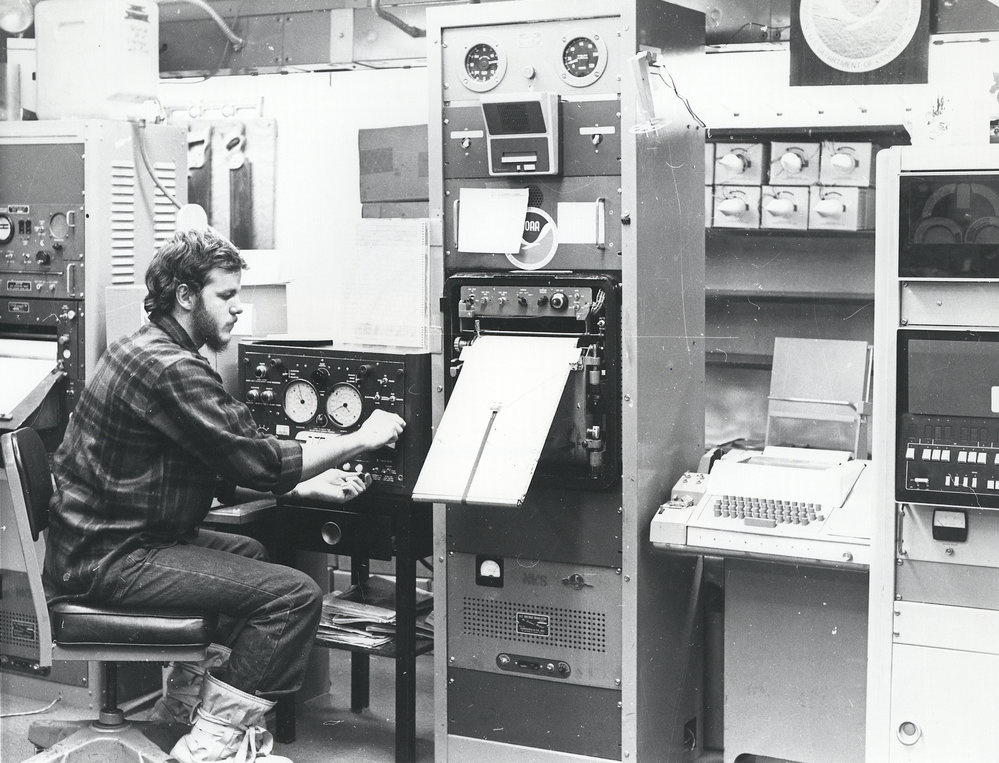 DescriptionMeteorological Equipment at the South Pole. Lloyd Anderson at Radiosonde tracking and recording equipment, 1976-1977.DepictsLloyd AndersonPhotographerIan PatersonSeason1976-1977Date Taken1976-1977 SeasonOriginalPrintNo. People1LocationSouth Pole