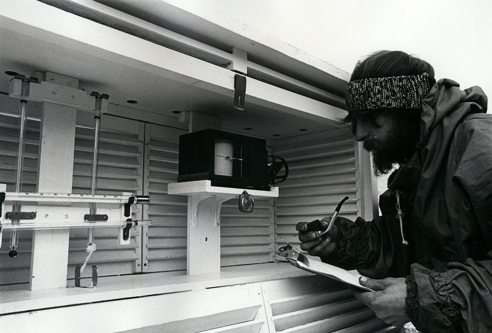 Tony Bromley takes reading from thermograph in met screen at Vanda Station.