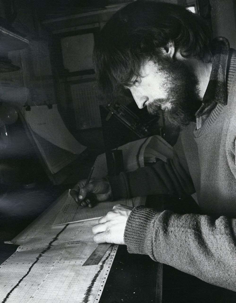 DescriptionTony Bromley, the weatherman at Vanda Station, notes wind velocity and direction readings from chart, Dec 73.DepictsTony BromleyPhotographerFrederick P SzydlikOriginalPrintNo. People1LocationVanda Station