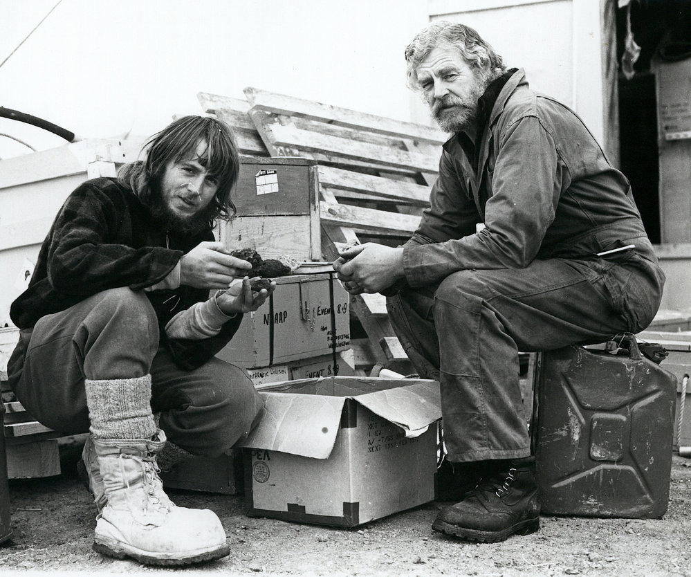 DescriptionJohn Palmer (surveyor| left) and Jim Rankin (base engineer) looking over rock samples| 1976-1977DepictsJohn PalmerJim Rankin PhotographerRobin OrmerodUnknownSeason1976-1977Date Taken1976-1977 SeasonOriginalPrintNo. People2-5LocationScott Base