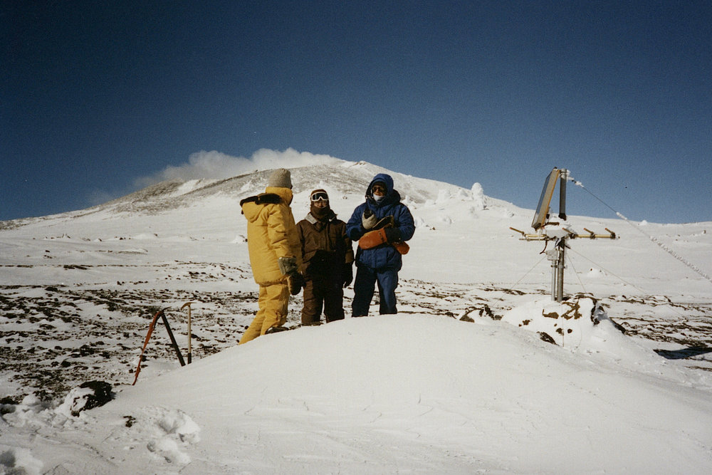 DescriptionO'Brien, Shimizu, and Kennedy at telemetry transmitter at Truncated Cones (CDNZ) with Erebus Summit cone behind, RRD, Dec 89.DepictsBrent O'BrienShimizuSeason1989-1990Date Taken1989-1990 SeasonOriginalPrintNo. People2-5LocationMount Erebus