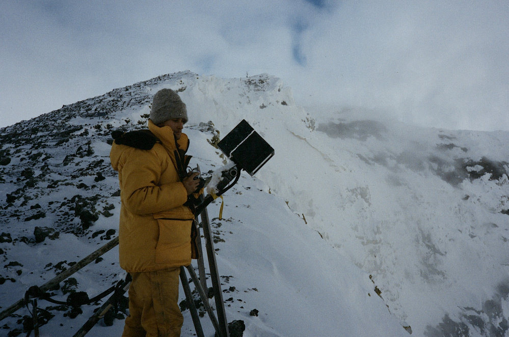 Brent O'Brien beside Erebus TV camera on the crater rim| RRD| Dec 1989