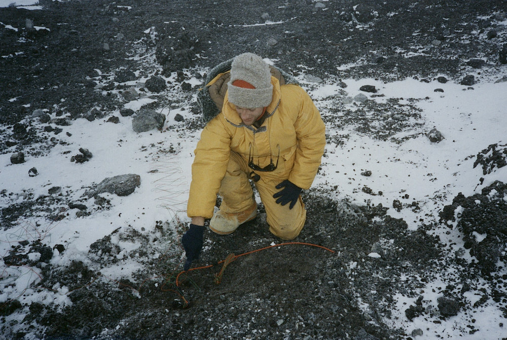 DescriptionA small seismic charge of 1m pf red det cord ready for firing on the surface. Brent O'Brien is pointing to the electric detonatorDepictsBrent O'BrienPhotographerRay DibbleUnknownSeason1989-1990Date Taken1989-1990 SeasonOriginalPrintLocationMount Erebus
