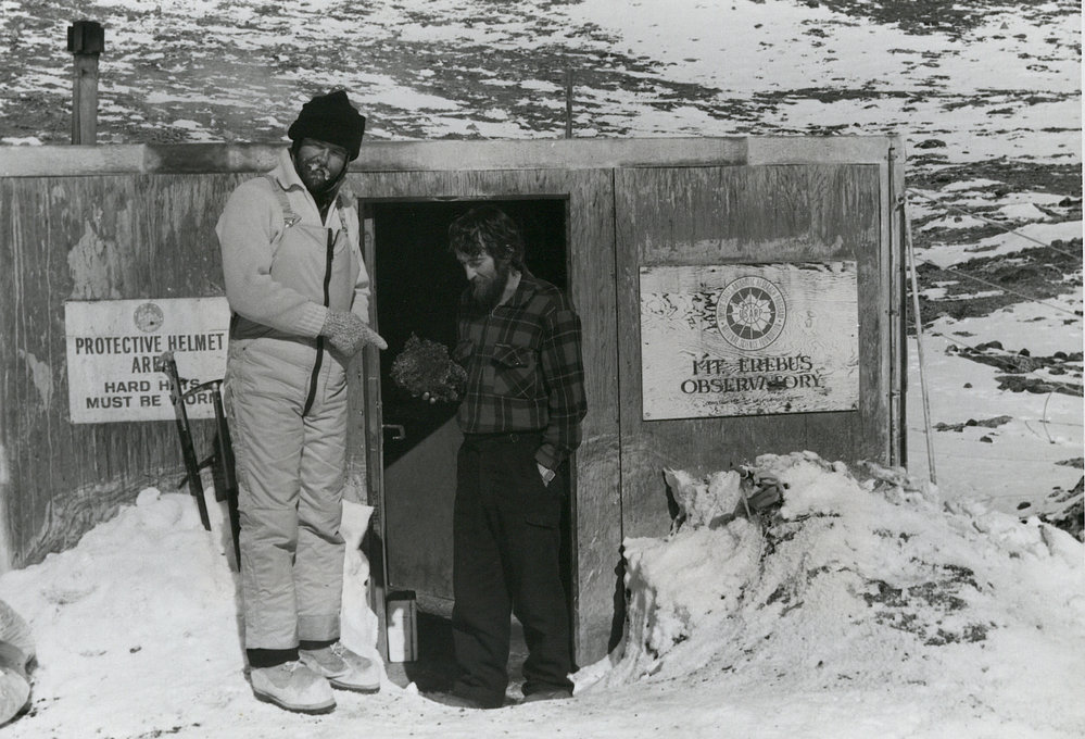 DescriptionG Blick and B Scott with lava bomb at Erebus HutDepictsGraeme BlickB ScottPhotographerPeter OtwayUnknownSeason1984-1985Date Taken1984-1985 SeasonOriginalPrintNo. People2-5LocationMount Erebus