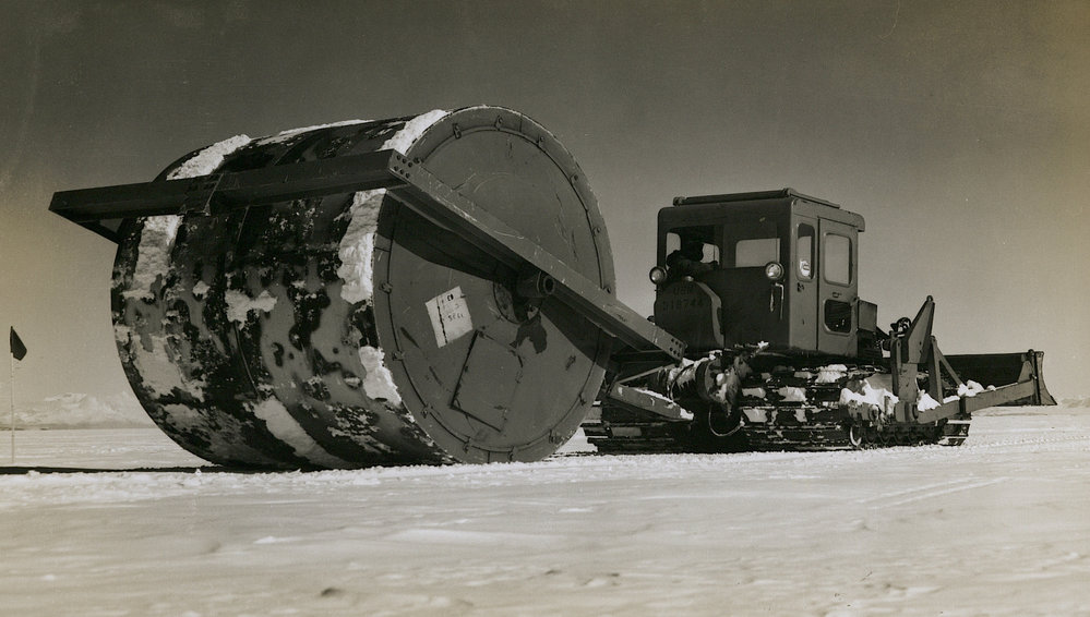 Task Force 43: Five thousand pound roller, pulled by a tractor is used to compact the top four inches of snow at the runways at McMurdo Sound and produce a solid surface for aircraft traffic 6/12/61