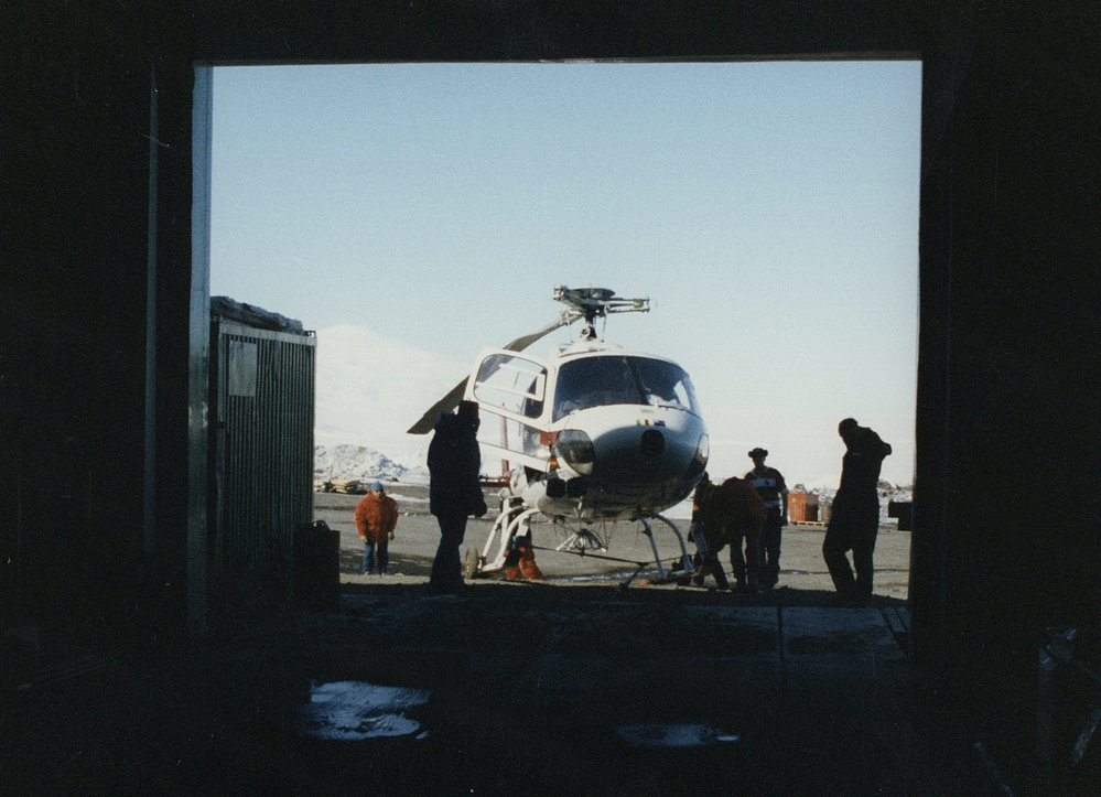 DescriptionHNZ helicopter in Scott Base garage| 1994-996PhotographerS ScottUnknownSeason1994-1995Date Taken1994-1995 SeasonOriginalPrintNo. People5-10LocationScott Base
