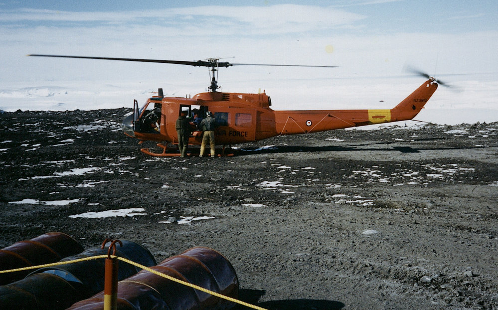 DescriptionRNZAF helicopter at Scott Base| Dec 1989PhotographerRay DibbleUnknownSeason1989-1990Date Taken1989-1990 SeasonOriginalPrintNo. People2-5LocationScott Base