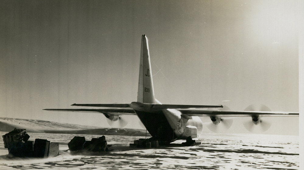 DescriptionBrilliant Antarctic sun makes a near silhouette image of a C-130 Hercules which has just completed a record making long range logistic flight from McMurdo Sound to Eights Coast, in support of scientific studies conducted in Operation Deep Freeze. The aircraft offloads supporting cargo and equipment for the establishment of a geologic field party in this remote area of the worlds southern most continent| 10/12/60PhotographerFrank KazukaitisUnknownSeason1960-1961Date Taken1960-12-101960-1961 SeasonOriginalPrintCopyright OwnerAntarctica New ZealandNo. People0LocationMcMurdo SoundGeolocation[1] Position[2]