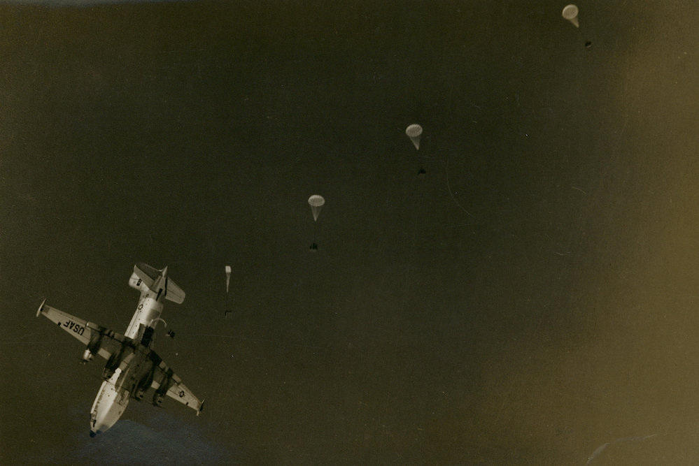 DescriptionAir Force C-124 attached to Operation Deep Freeze drops fuel drums by parachute to Byrd Station 800 miles inland. The airdrop supply method was used to bring bulk items to inland stations before use of the C-130 Hercules began in 1960. The Hercules, which is able to land in snow has revolutionised re-supply of inland stations| 2/11/61PhotographerA E TilleyUnknownSeason1961-1962Date Taken1961-1962 SeasonOriginalPrintLocationByrd Station