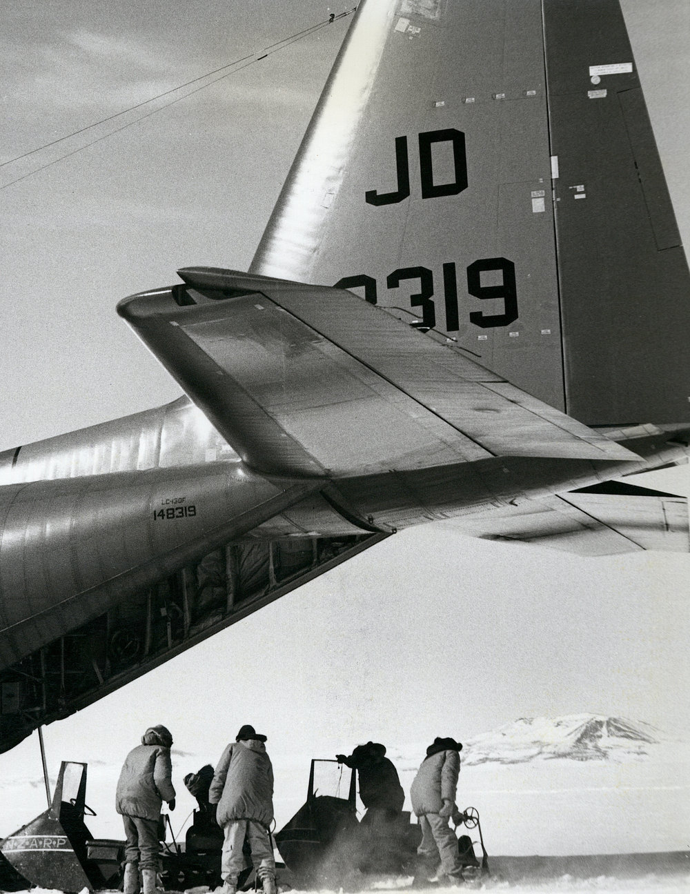 DescriptionDwarfed by the tail of a C-130 aircraft| members of the Victoria University's geological research team unload their motor toboggans and sledges on the Evans Neve| 8000ft above sea level in northern Victoria Land| Antarctica| 17/11/71PhotographerRichard (Dick) K McBrideUnknownSeason1971-1972Date Taken1971-1972 SeasonOriginalPrintLocationEvans Neve