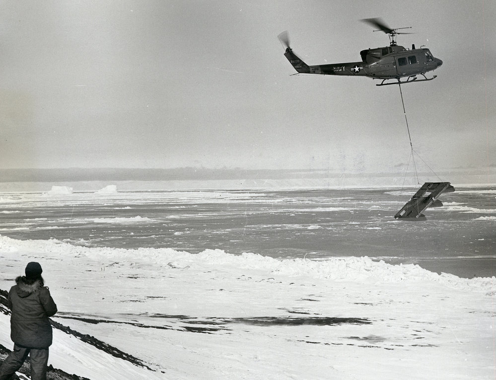 DescriptionA member of the New Zealand Antarctic Research Programme watches as a US Navy helicopter carries the Canterbury University's trimaran from the Cape Bird Hut where it spent the winter in storage| to the edge of the sea ice. After fitting it with outboard motors and scientific equipment the trimaran will be used for taking samples of marine life from the sea floor in the area north of Ross Island| 6/11/71PhotographerRichard (Dick) K McBrideUnknownSeason1971-1972Date Taken1971-1972 SeasonOriginalPrintNo. People1LocationCape Bird