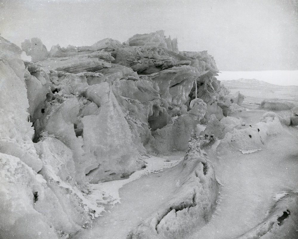 DescriptionSunlight on pressure ridges| 1962-1963PhotographerGuy ManneringUnknownSeason1962-1963Date Taken1962-1963 SeasonOriginalPrintLocationScott Base