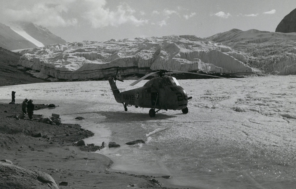 Helecopter lands on Lake Bonney| Taylor Glacier in the background| 1962-1963, VUWAE