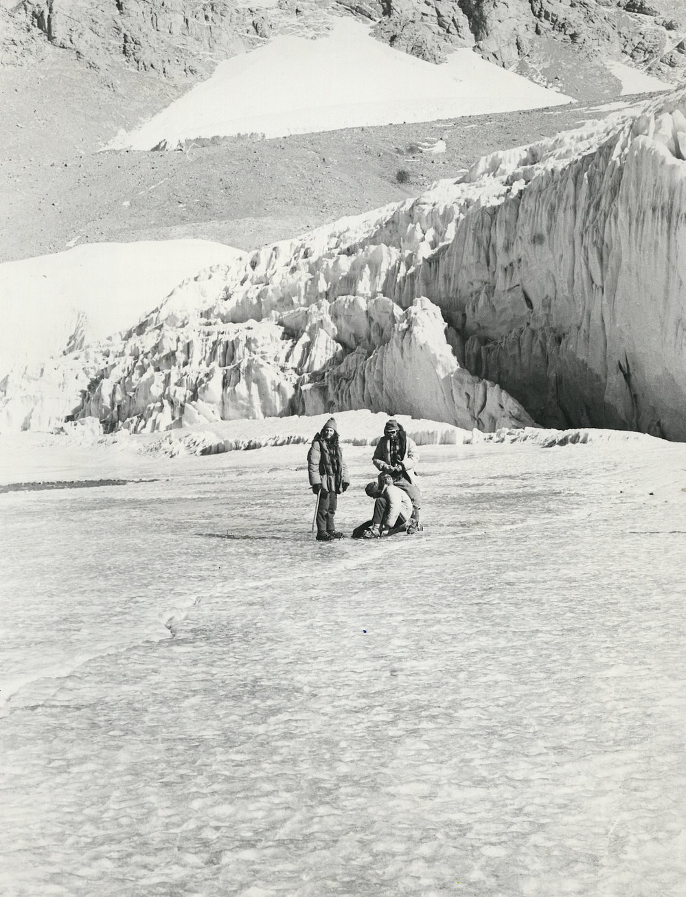 DescriptionOn ice of Lake Bonney below the Taylor Glacier snout| Nov 1976PhotographerRobin OrmerodUnknownUnknownSeason1976-1977Date Taken1976-1977 Season1976-1977 SeasonOriginalPrintNo. People2-52-5LocationLake BonneyLake Bonney