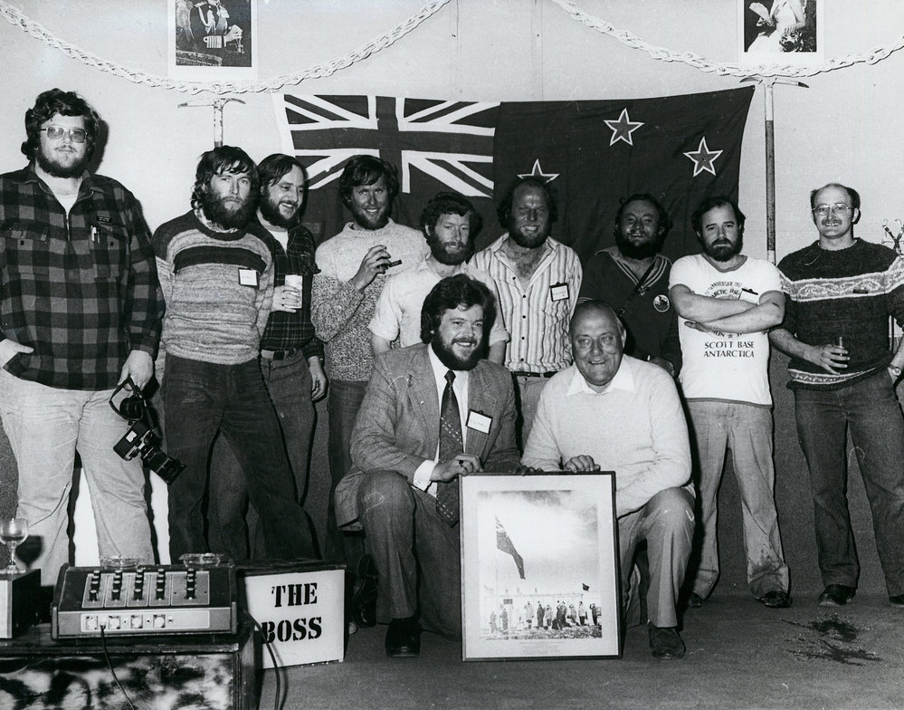 DescriptionWinter over team| L-R Chris Choros| Ross Mason| Pete Wheeler| Rick Welsh| Keith Martin| Gary Bowcock| Pete Nelson| Graeme Morgan| Alister Babbington| front| Leo Slattery with Sir Robert Muldoon| Jnauary 1982DepictsChris ChorosRoss MasonPete WheelerRick WelshKeith MartinGary BowcockPete NelsonGraeme MorganAlister BabbingtonLeo SlatterySir Robert MuldoonPhotographerUnknownSeason1982-1983Date Taken1982-1983 SeasonOriginalPrintNo. People>10LocationScott Base