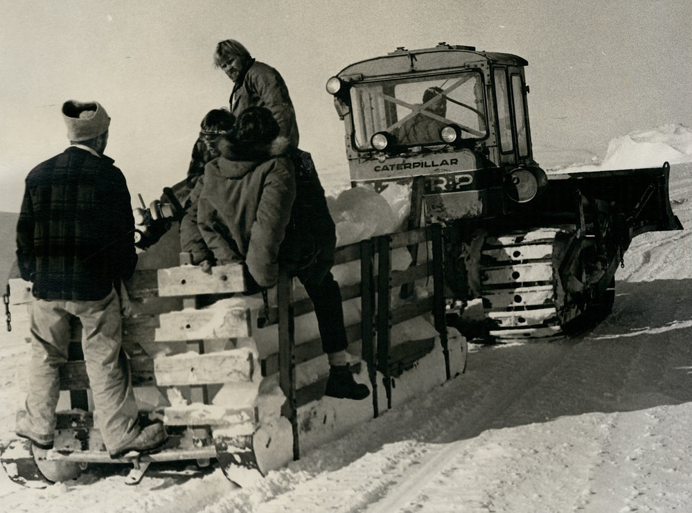 DescriptionIce Party' head for home after filling sledge with snow| 7/11/72PhotographerBruce LaybournUnknownSeason1972-1973Date Taken1972-1973 SeasonOriginalPrintNo. People2-5