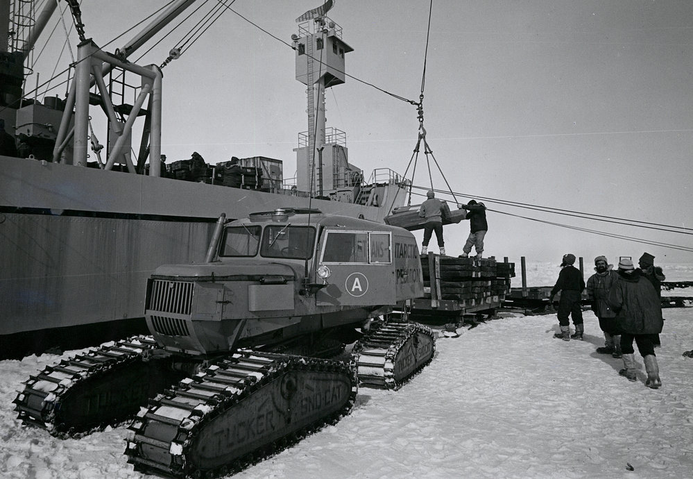 DescriptionScott Base men load a sno-cat sledge with building materials brought to Antarctica on the Operation Deep Freeze cargo ship 'Mirfak' shich is moored in McMUrdo Sounds sea ice.PhotographerGuy ManneringUnknownOriginalPrintNo. People5-10LocationMcMurdo Sound