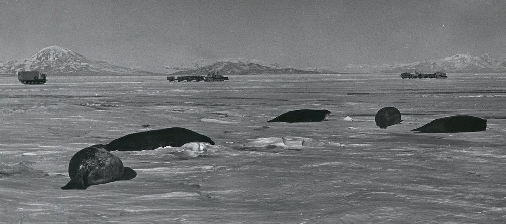 DescriptionDVDP tractor train passes a group of Weddell seals on McMurdo Sound sea ice| 29/10/75PhotographerNeville PeatUnknownSeason1975-1976Date Taken1975-1976 SeasonOriginalPrintLocationMcMurdo Sound