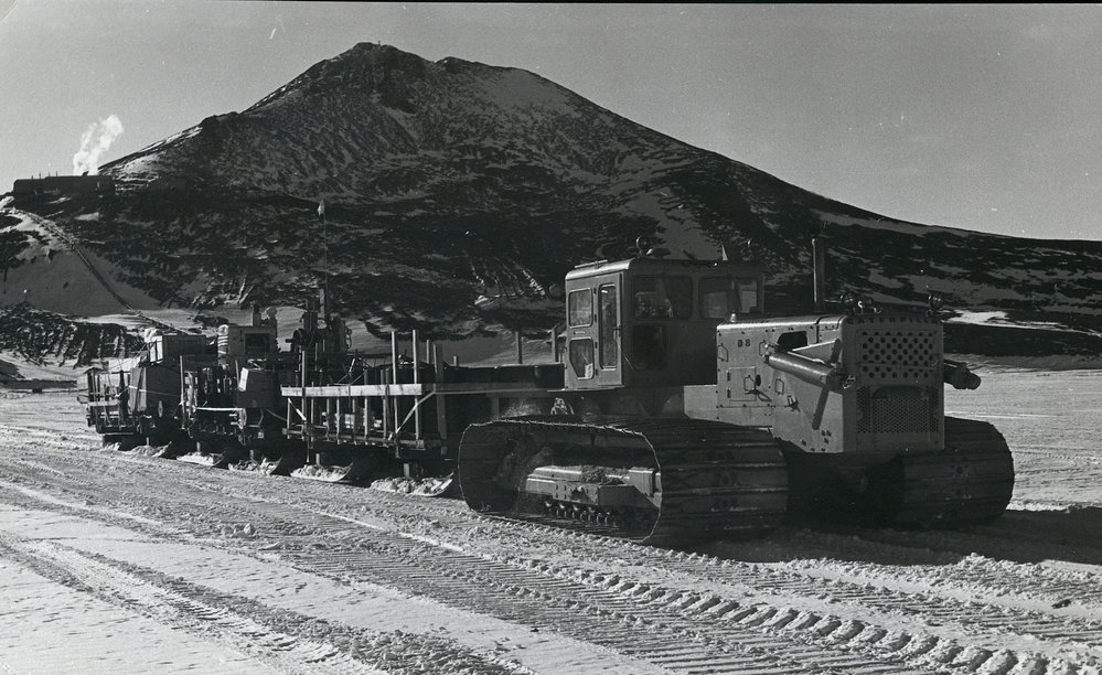 Caterpillar D8 hauling three sledges leaves McMurdo bound for DVDP drill site 1A