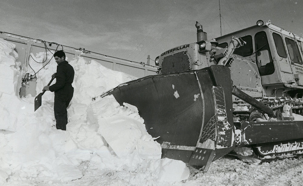 DescriptionClearing snow from new command center site| 1982-1983PhotographerKim WesterskovUnknownSeason1982-1983Date Taken1982-1983 SeasonOriginalPrintNo. People1LocationScott Base