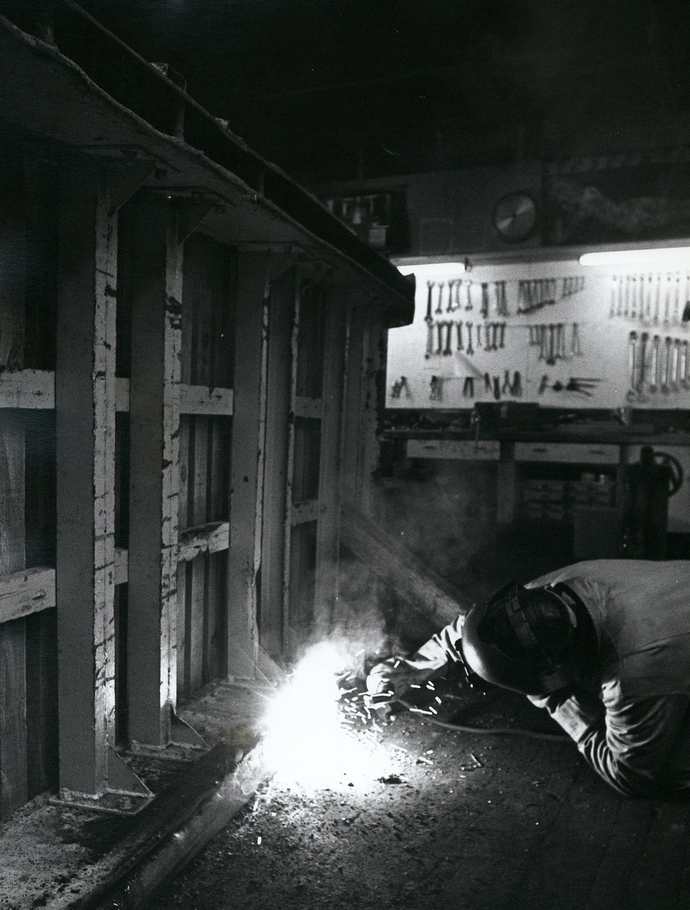 DescriptionScott Base engineer| Bill Johnson welds a runner to the bottom of a large ice sledge| November 1973DepictsBill JohnsonPhotographerFrederick P SzydlikUnknownSeason1973-1974Date Taken1973-1974 SeasonOriginalPrintNo. People1LocationScott Base