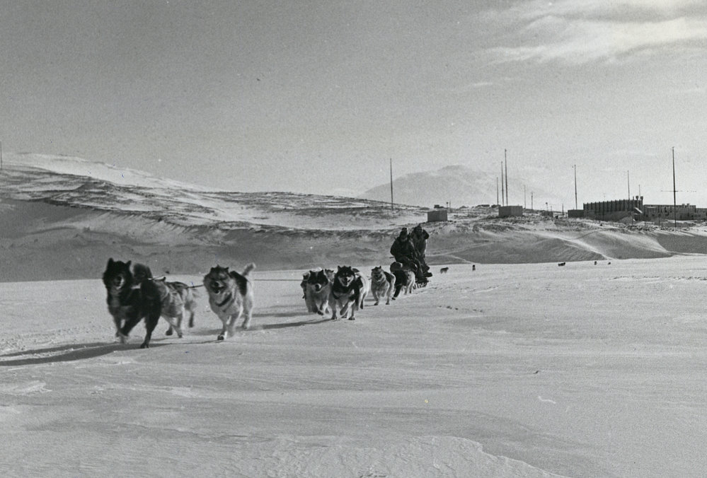DescriptionEnthusiastic over the chance for an outing, the dogs race away from their lines. Scott Base is visible in the background, and the few dogs left on their lines. The temperature that day was -26PhotographerG HalliganUnknownOriginalPrintNo. People2-5LocationScott Base