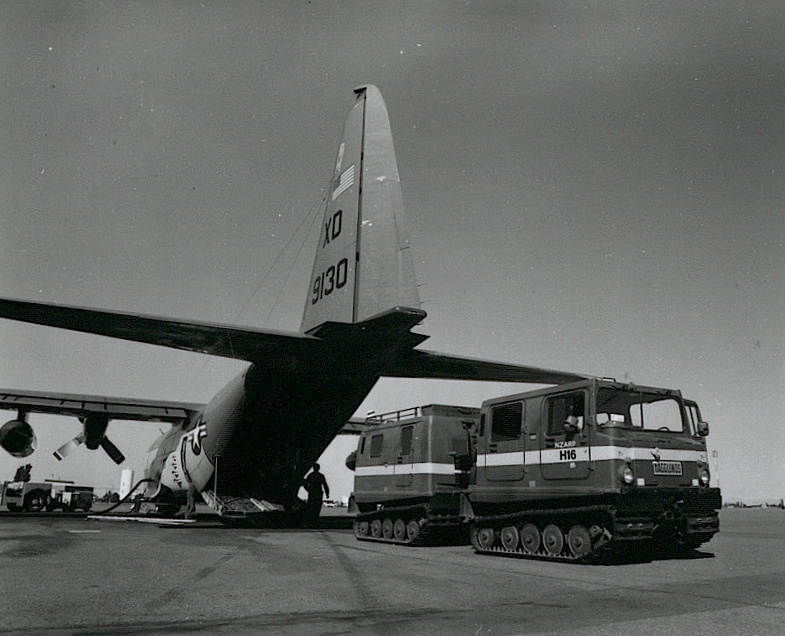 DescriptionNew Hagglund being loaded on to C-130 Hercules for transport to Scott Base| 28/1/86PhotographerUnknownSeason1985-1986Date Taken1985-1986 SeasonOriginalPrintLocationHarewood