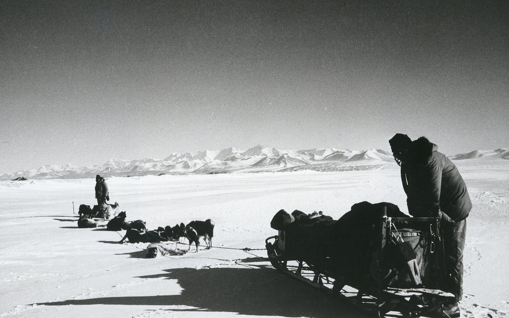 DescriptionCon Faber and Peter Cleary with dogs on sea ice en route to Blue Glacier| October 1979DepictsCon FaberPeter ClearyPhotographerColin MonteathUnknownSeason1979-1980Date Taken1979-1980 SeasonOriginalPrintNo. People2-5LocationBlue Glacier