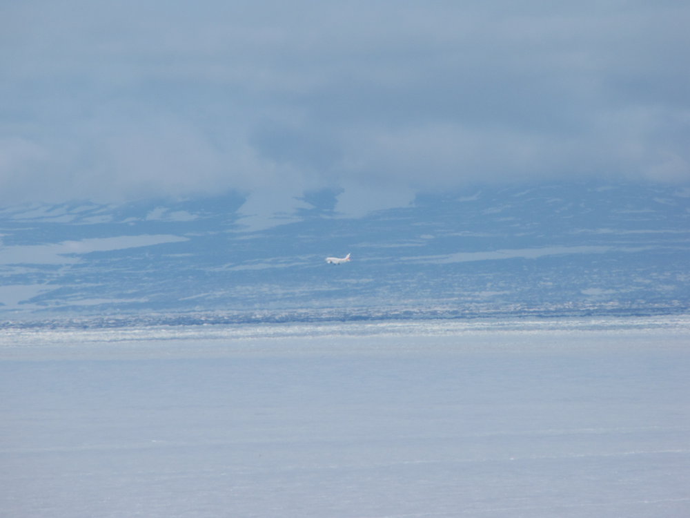 In November 2014 a commemoration was held to mark the Erebus Disaster - the final continent of Erebus families travelled to Scott Base to hold a service and remember the lost. This picture shows their plane coming into land at Pegasus Ice Runway, seen from Arrival Heights.