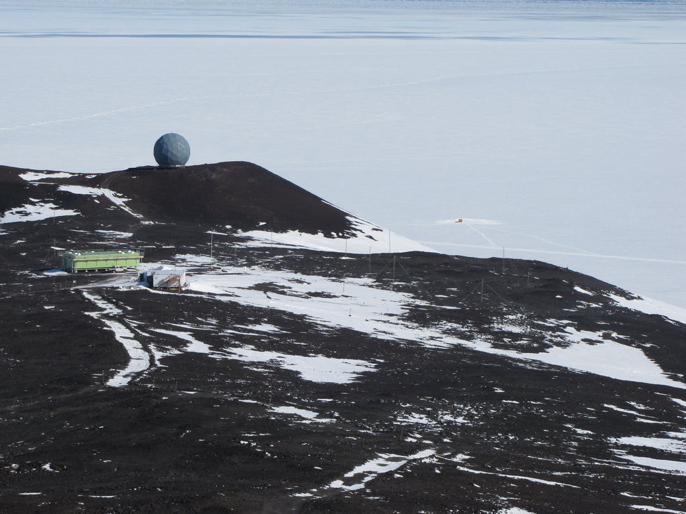 The Arrival Heights laboratories and experimental antennas as seen from the lip of second crater. The NZ lab (green building), US Lab I(white shack) and the black Telecom Dome are all visible.