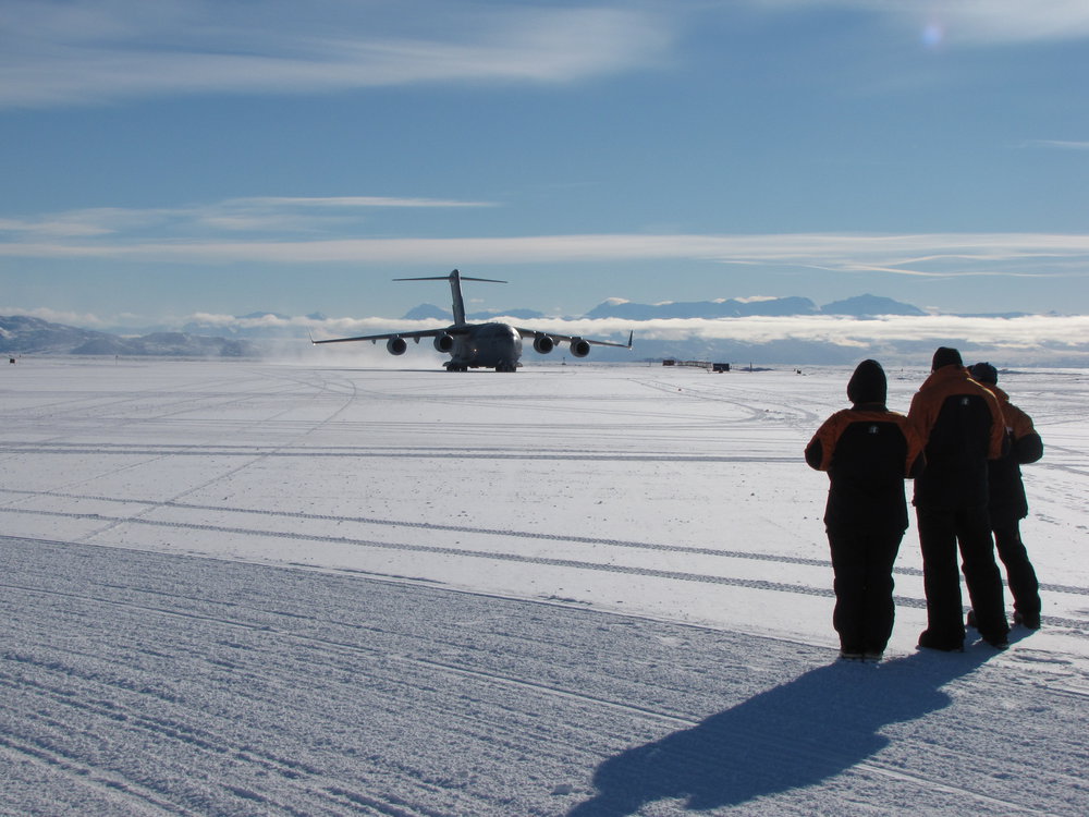 A group of Kiwi's in Antarctica New Zealand issued clothing watch the UASF C17 taxi across the ice towards the Antarctic Passenger Terminal at Pegagsus Ice Runway. This was the second to last C17 flight to arrive on the ice in 2014.