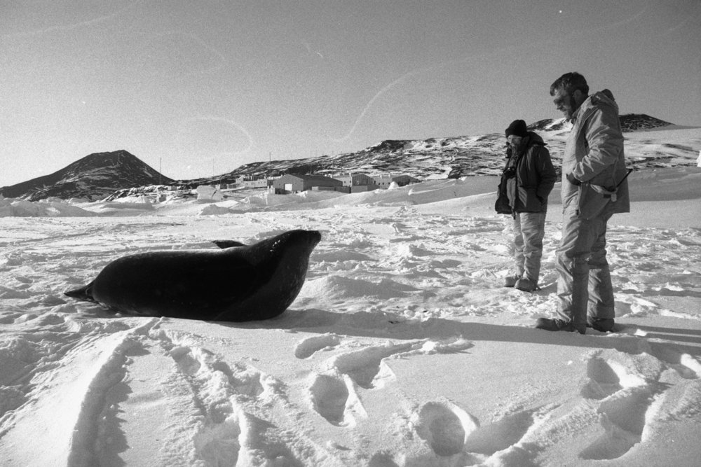 DescriptionInvited visitors| Margaret Austin and Dave Geddes| with Weddell sealDepictsMargaret AustinDave GeddesPhotographerUnknownSeason1988-1989Date Taken1988-1989 SeasonOriginalFilmNo. People2-5LocationNear Scott Base