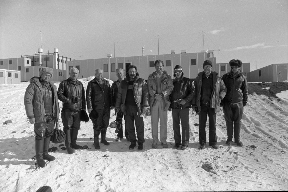 official inspection team form Soviet Union| with Dave Crerar OIC| in front of Scott base sign. Antarctica NZ, accessed 24/03/2026, https://adam.antarcticanz.govt.nz/nodes/view/42526