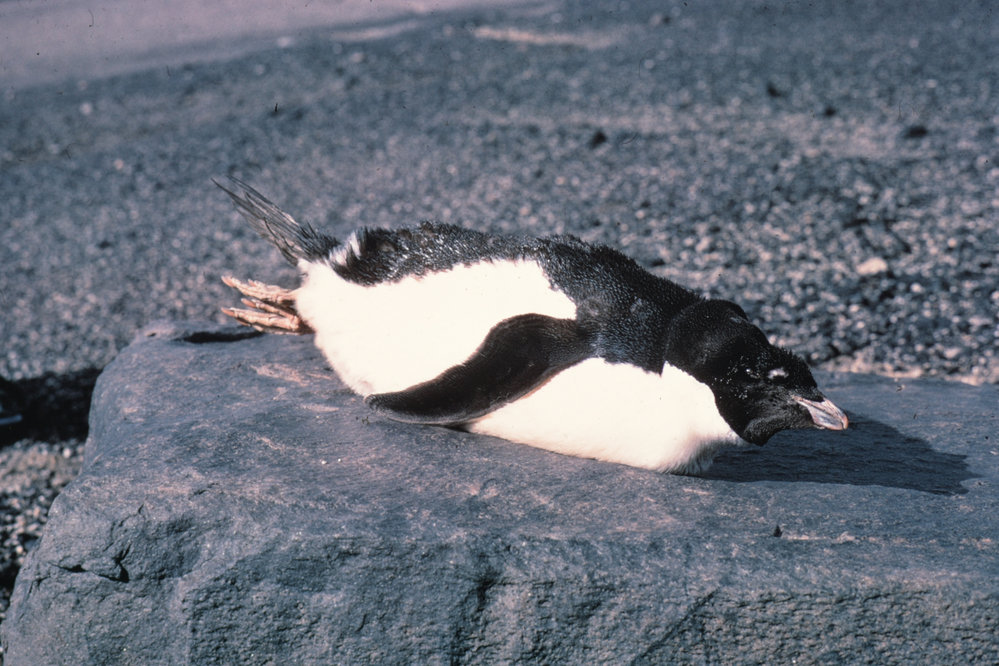 DescriptionAnimals, Dead Adelie Penguin found three miles from coastPhotographerD RobertsSeason1990-1991Date Taken1990-1991 SeasonOriginalSlideLocationMeines Valley