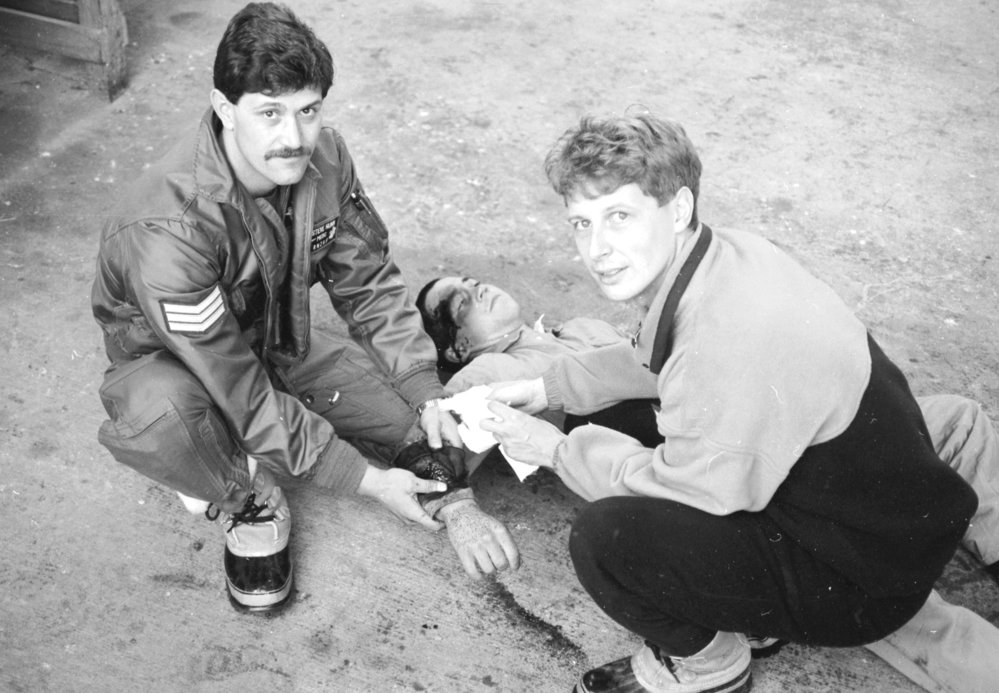 Steve Hunn demonstrating bandaging to Kevin Townsend (NZ Herald)
