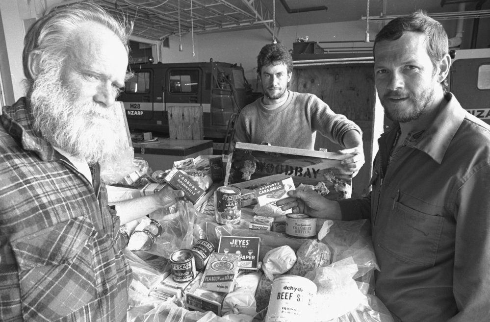 Garth Varco, Nigel Crabbe and Jack Jenniskens with the NZGS food and fuel cache they and Cath Gilmour recovered from Igloo Spur. Antarctica NZ, accessed 02/04/2026, https://adam.antarcticanz.govt.nz/nodes/view/42794