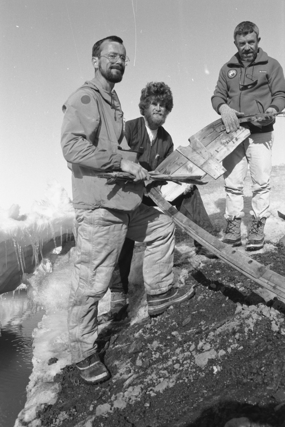 DescriptionRoss McDonald| Phil Clerke| Dave Geddes| with parts of the dinghy| found after summer's extraordinary melt| thought to be the pram dinghy after which Pram Point was namedDepictsRoss McDonaldPhil ClerkeDave GeddesPhotographerCath GilmourUnknownSeason1990-1991Date Taken1990-1991 SeasonOriginalFilmNo. People2-5LocationPram Point