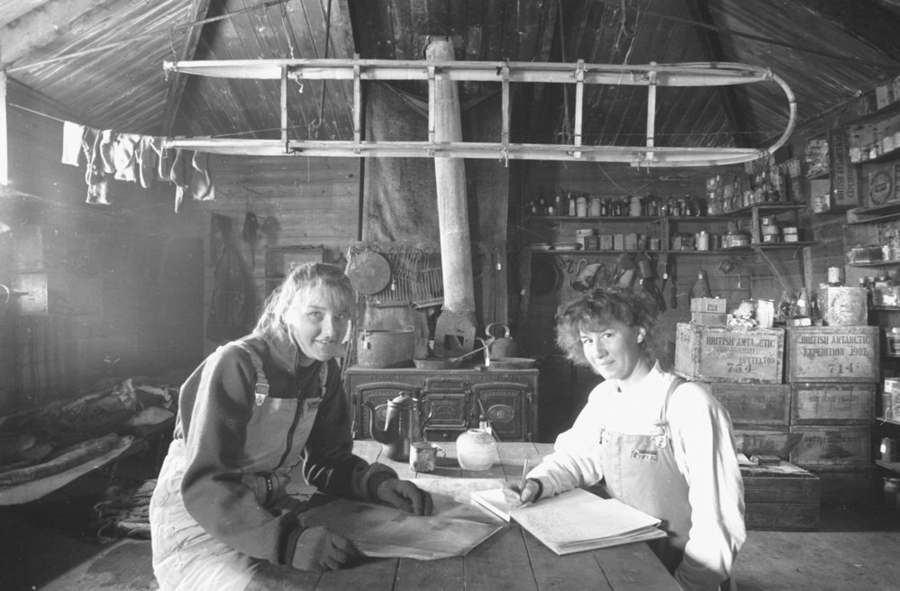 Lynne Cambell|and unknown| of Antarctic Heritage Trust| conservators| in Cape Royds hut