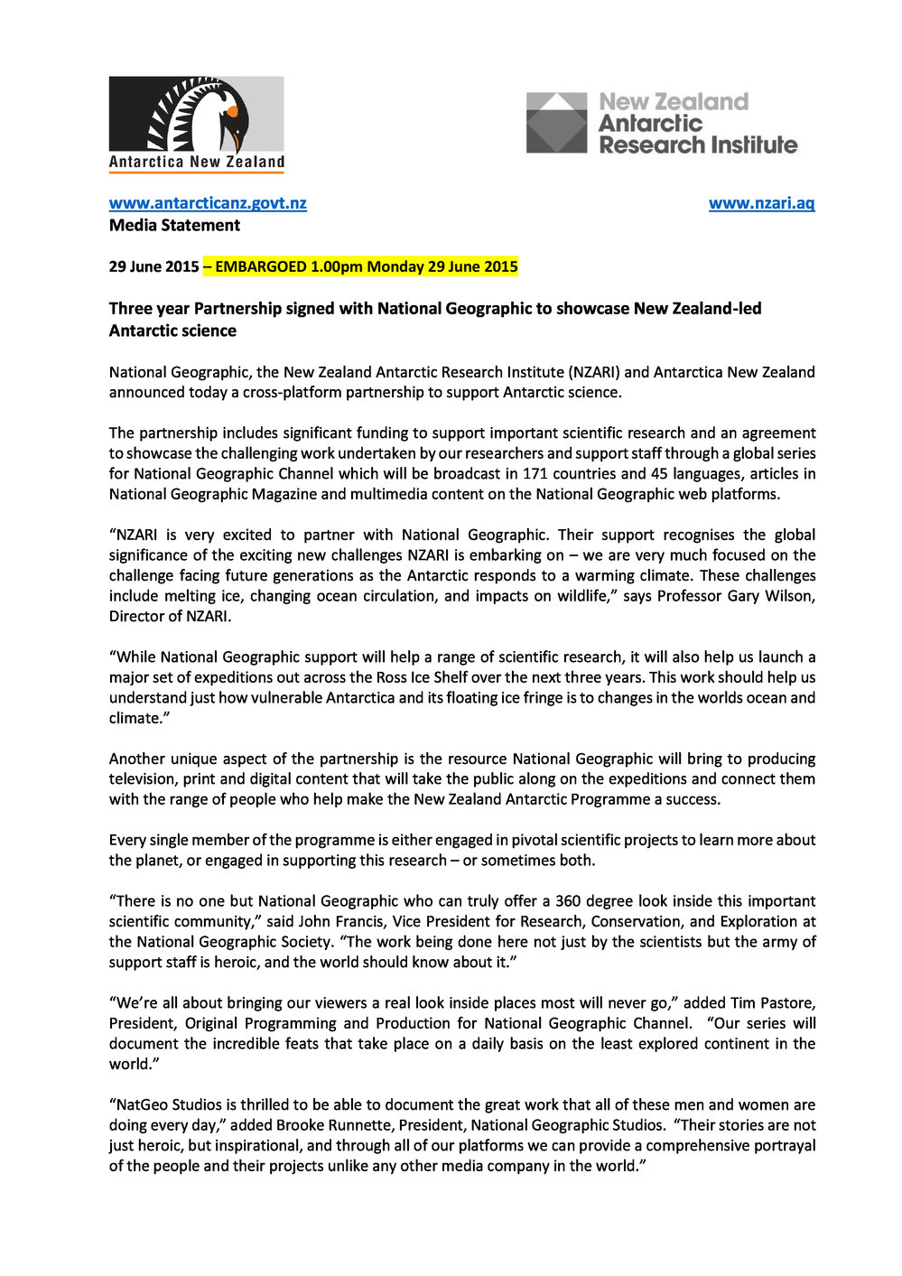PR - Three year Partnership signed with National Geographic to showcase New Zealand-led Antarctic science - 29 June 2015