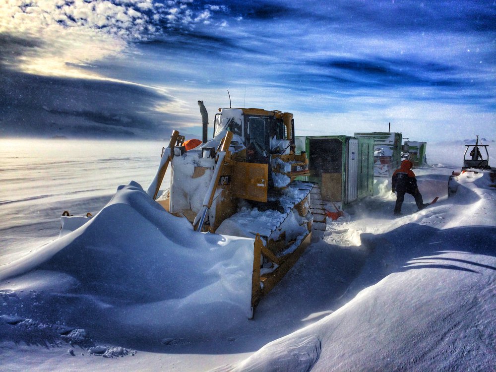 Dozer and equipment covered in snow, Traverse out to Granite Harbour (K082 dive event),