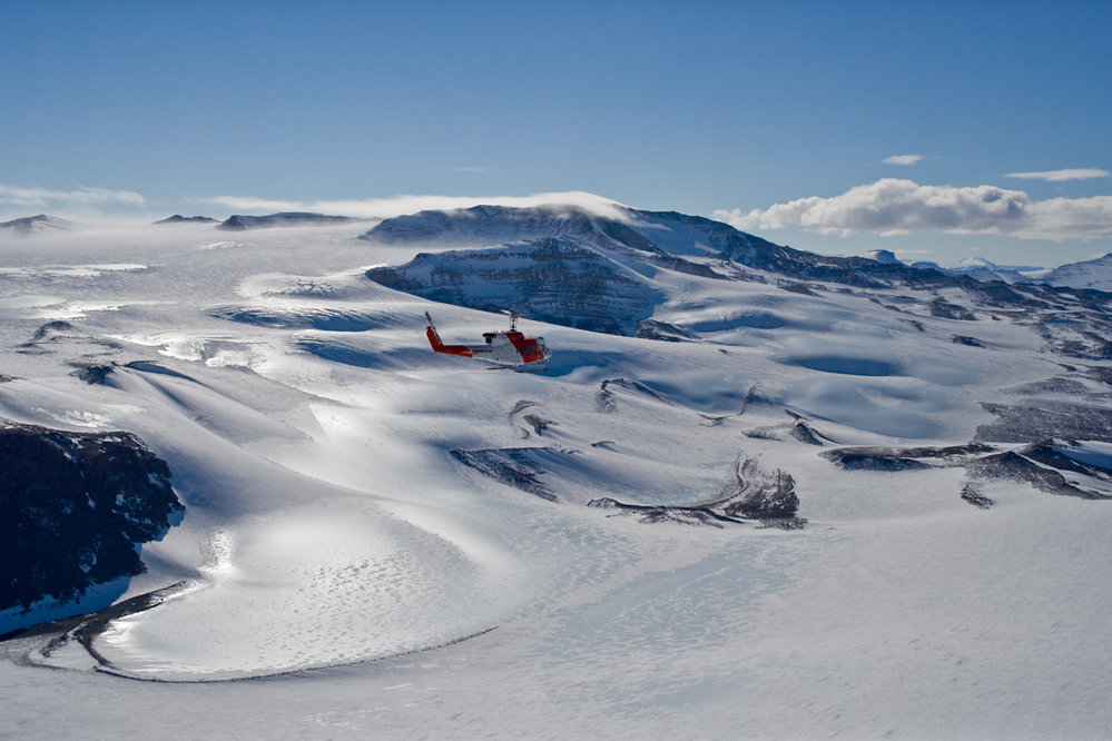 Aerial. Shapeless Mountain area. Bell 212 helicopter
