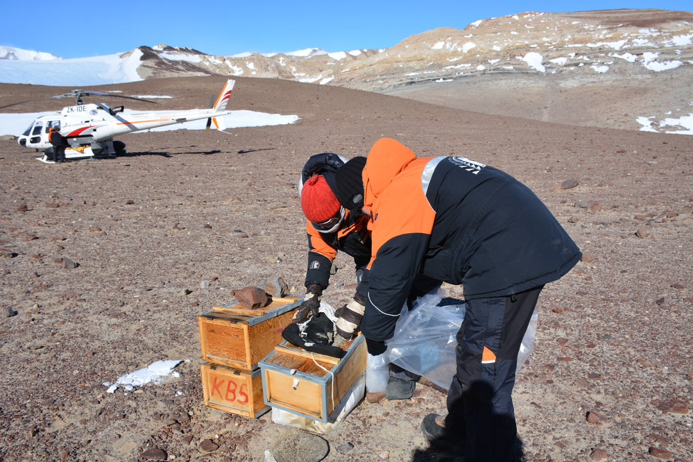 Removal of a historic cache site, Allan Hills: AntNZ’s Ceisha Poirot and Antarctic Heritage Trust Programme Manager Lizzie Meek document and remove items cached adjacent to the Odell Glacier, including jerry cans of fuel, and food boxes