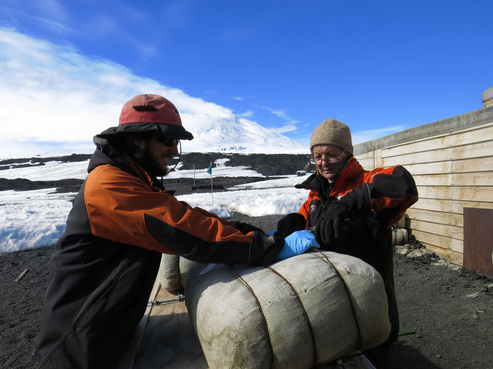 AHT Conservators Josiah Wagener and Nicola Dunn in the process of re-wrapping a 100 year old pony fodder bale at Terra Nova Hut, Cape Evans. Antarctica NZ, accessed 13/04/2026, https://adam.antarcticanz.govt.nz/nodes/view/45741