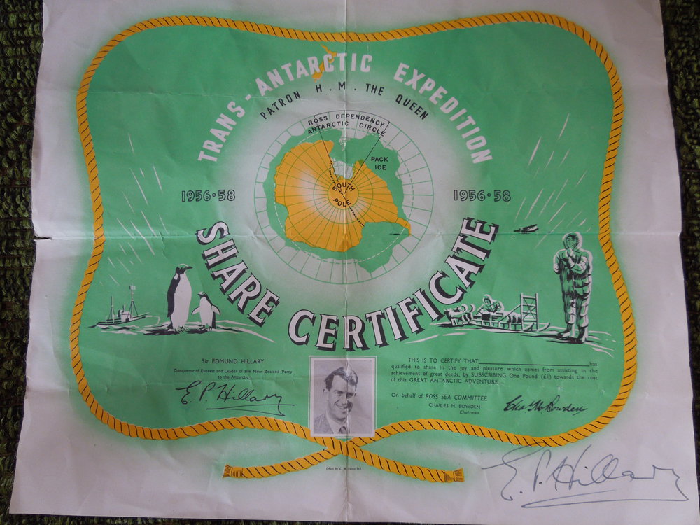 Share certificate from the Trans-Antarctic expedition, signed by Sir Edmund Hillary.