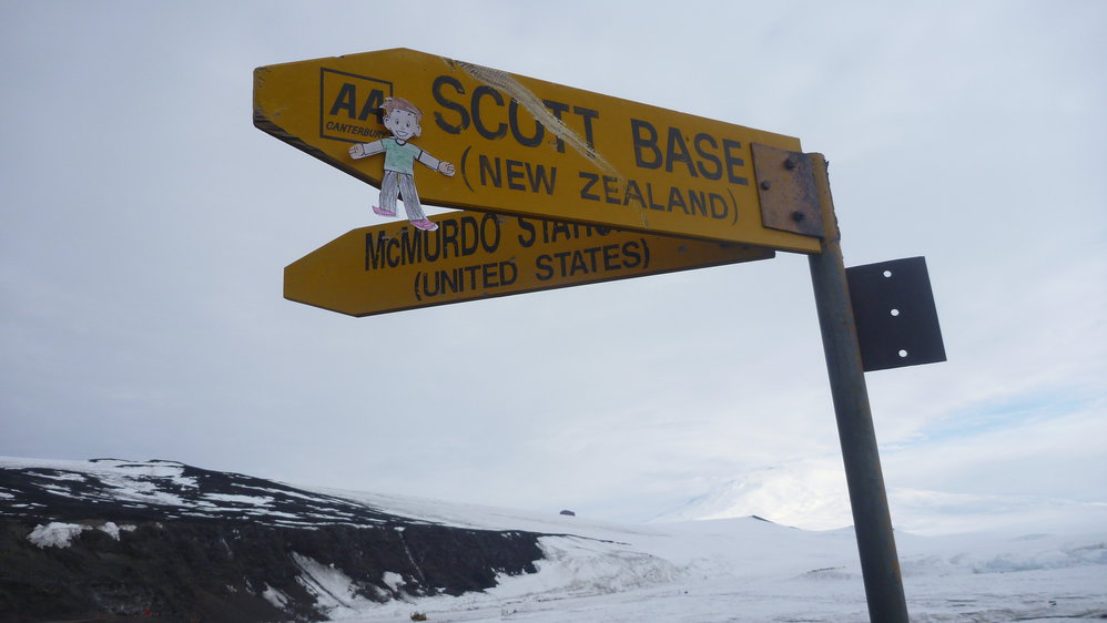 Flat Stanley Visits Antarctica - at the Scott Base sign